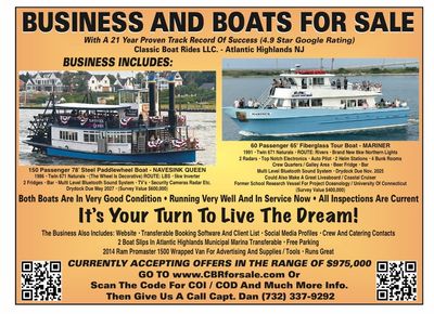 The best offer list price for the boat or boats only (and not the business) is based on the boat or boats relocating from the Atlantic Highlands / Highlands / Bayshore / Two Rivers area, Including Keyport and Perth Amboy. There will be a 1 year no compete clause. If the boat or boats stay in the area as described above there will be a surcharge added to the sale price.